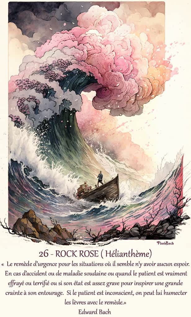 Le remède d’urgence pour les situations où il semble n’y avoir aucun espoir. En cas d’accident ou de maladie soudaine ou quand le patient est vraiment effrayé ou terrifié ou si son état est assez grave pour inspirer une grande crainte à son entourage. Si le patient est inconscient, on peut lui humecter les lèvres avec le remède.